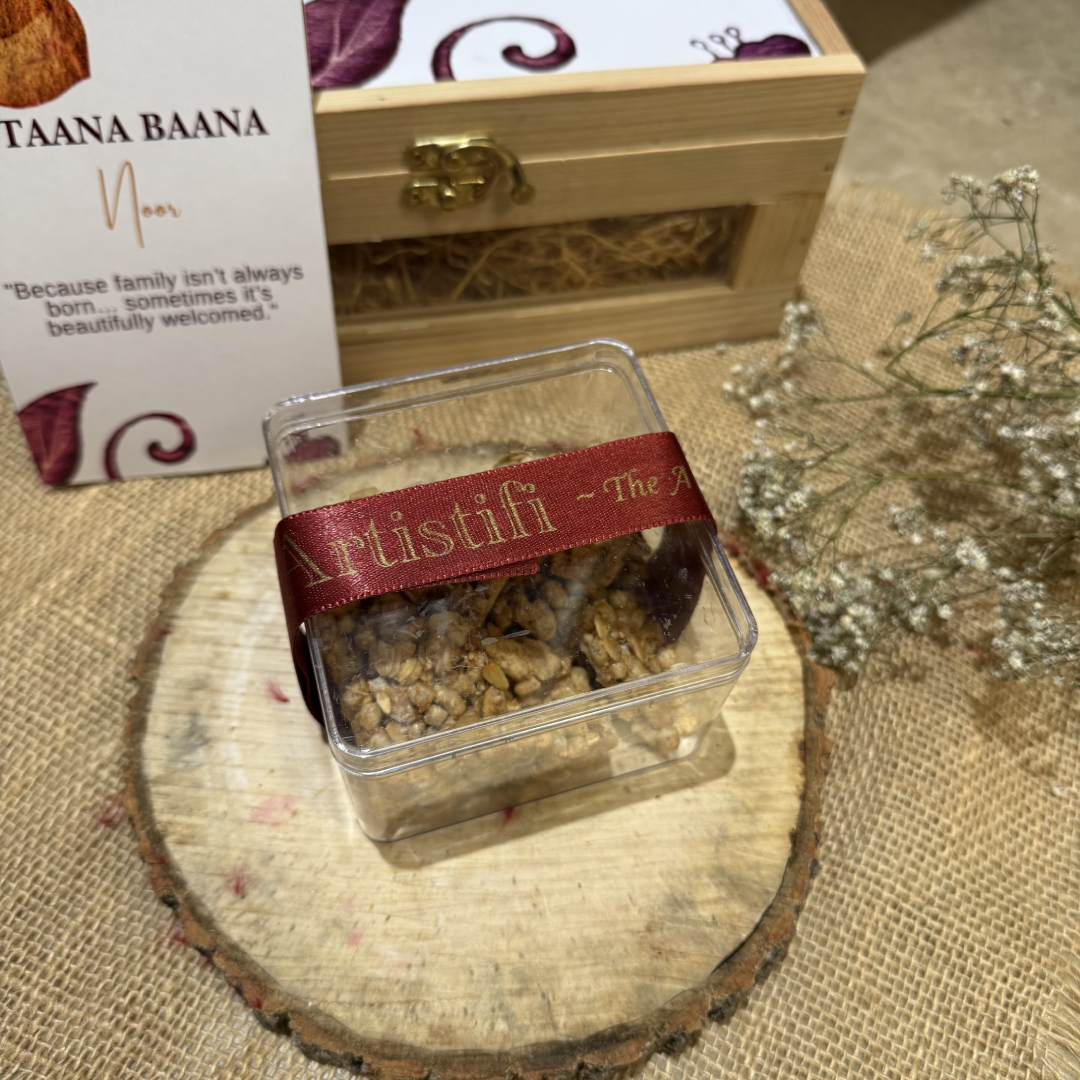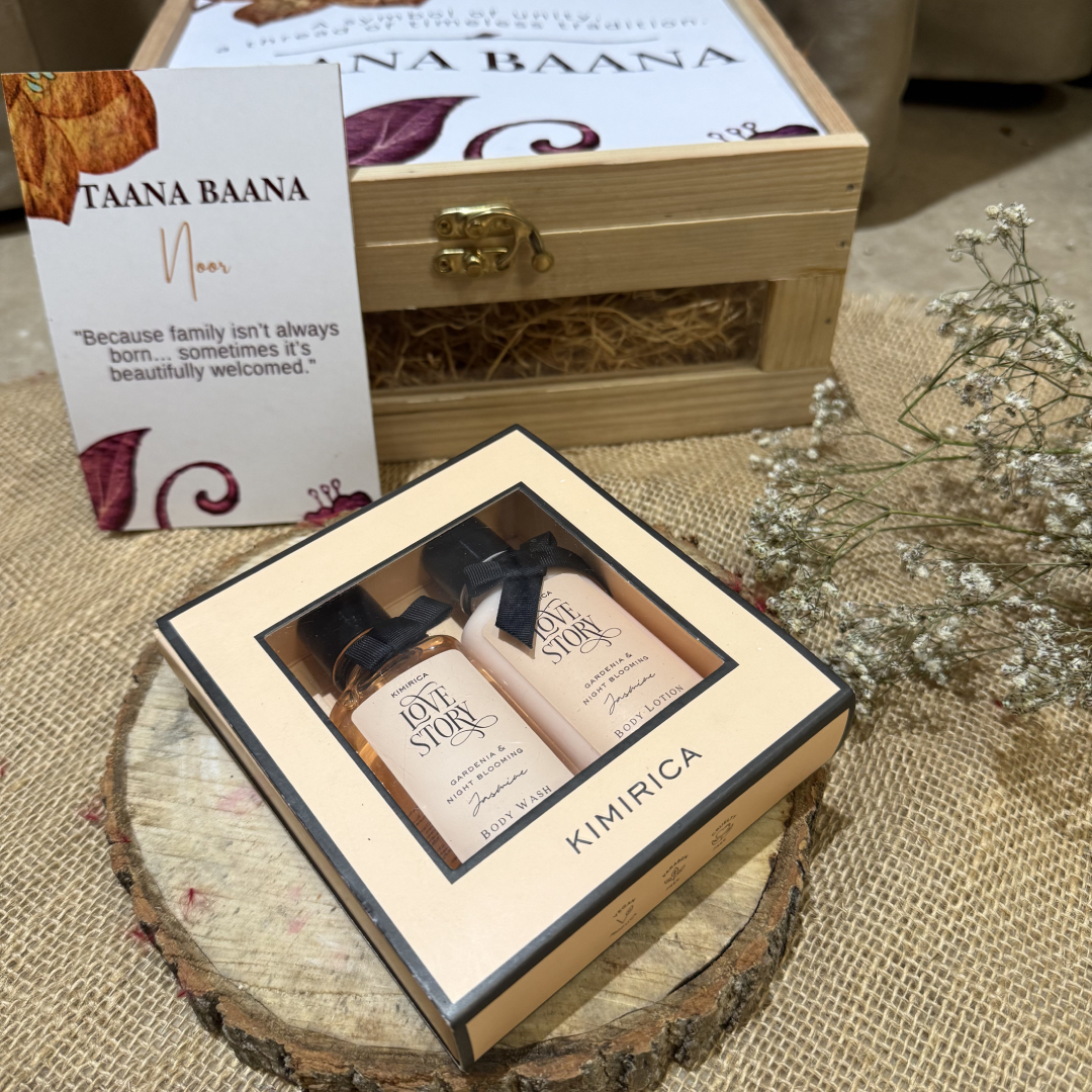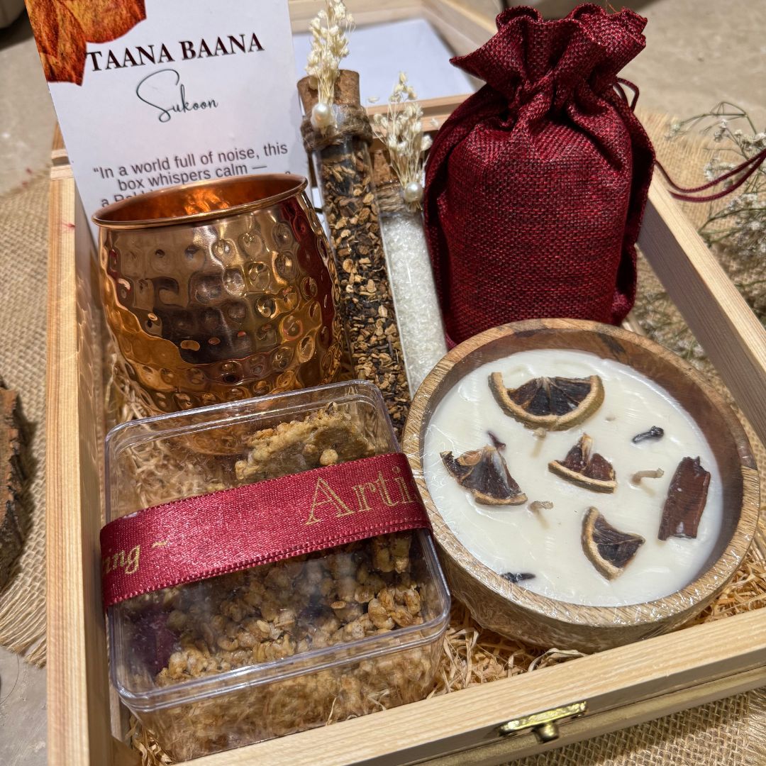Each Taana Baana hamper is handcrafted using products from homegrown and small businesses across India. Minor variations in ribbon, flowers, or jars may occur due to artisanal nature and availability.
